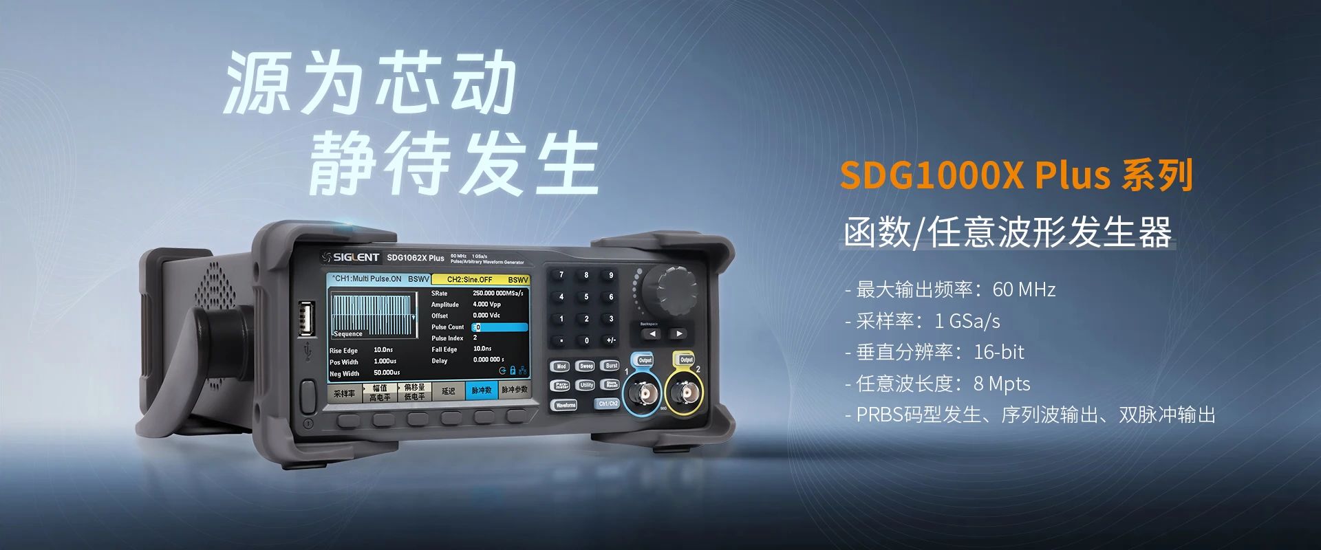 SDG1000X Plus系列具有16-bit高垂直分辨率,最高60MHz输出频率,20V输出幅度,1GSa/s采样率,8Mpts任意波点数,这些显著的性能提升使SDG1000X Plus成为工程师生成信号时更加不可或缺的工具。