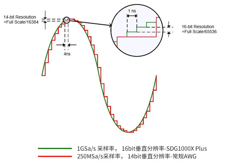 SDG1000X Plus采样率高达1GSa/s,是同类型产品的数倍。采样率是DAC在给定时间间隔内采样的样点数量,采样率越高,相同频率下的信号细节越丰富,波形质量越好。