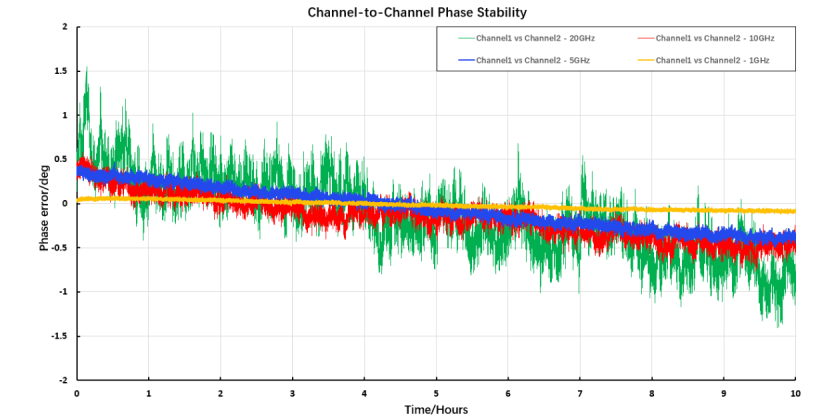 - 相参模式,载波频率=10 GHz ,环境温度变化±2℃,观测时间5小时,相位波动<1.5°